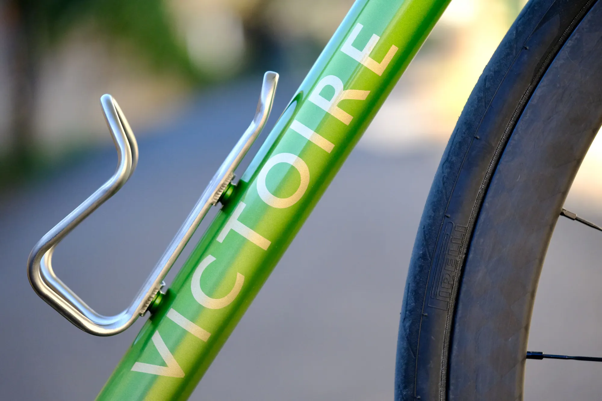 La peinture du Victoire n°503 est constituée de deux couleurs métallisées. La première est un vert anis qui recouvre l'avant du vélo ainsi que la fourche ENVE. L'arrière du cadre laisse apparaître l'inox ainsi que le travail de soudo-brasure réalisé à l'atelier grâce à un vernis transparent.
