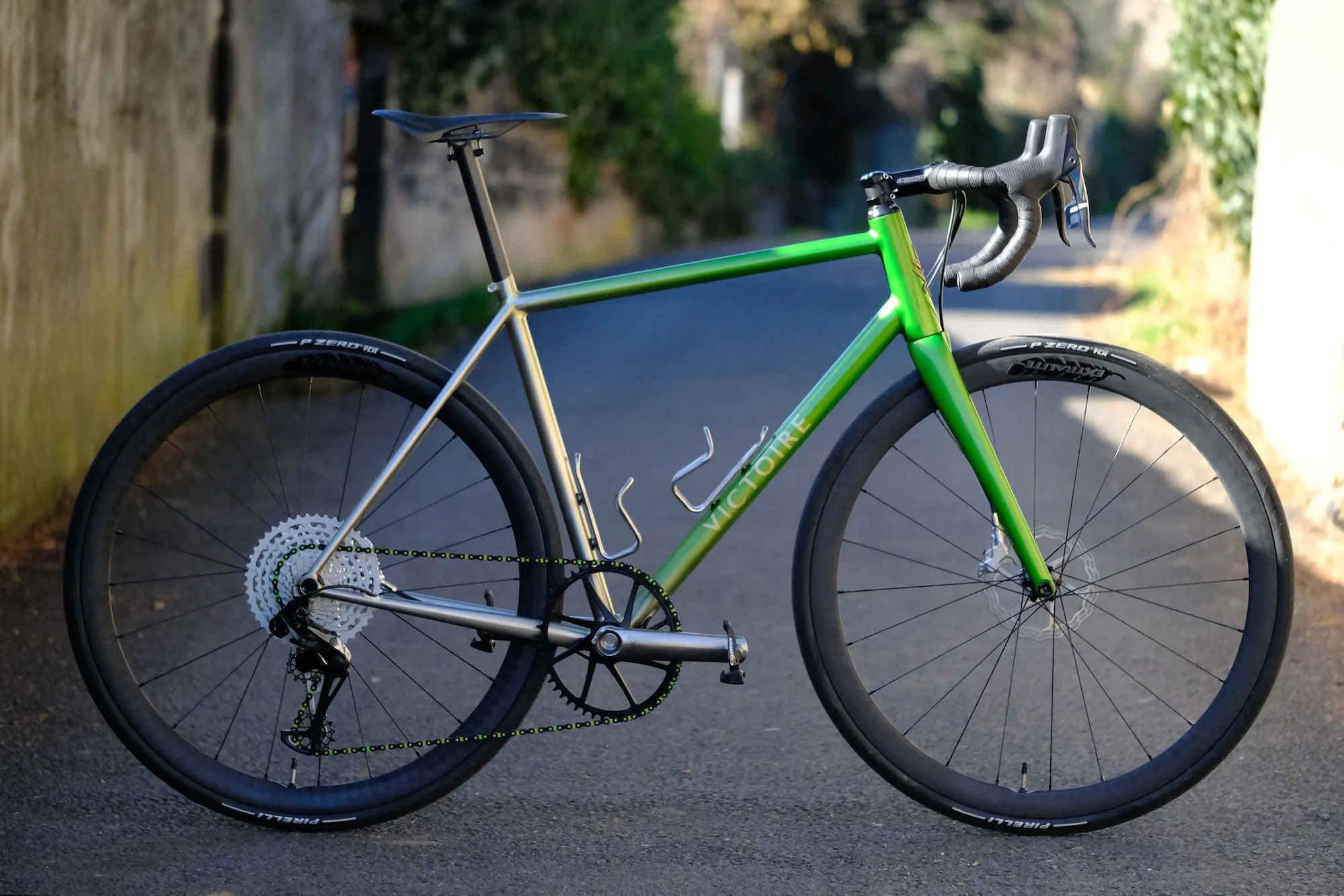 La chaine de la transmission du Victoire n°503 est une KMC DLC12, référence légère, durable, et choisie dans une anodisation noire et verte qui s'accorde à la finition du vélo.