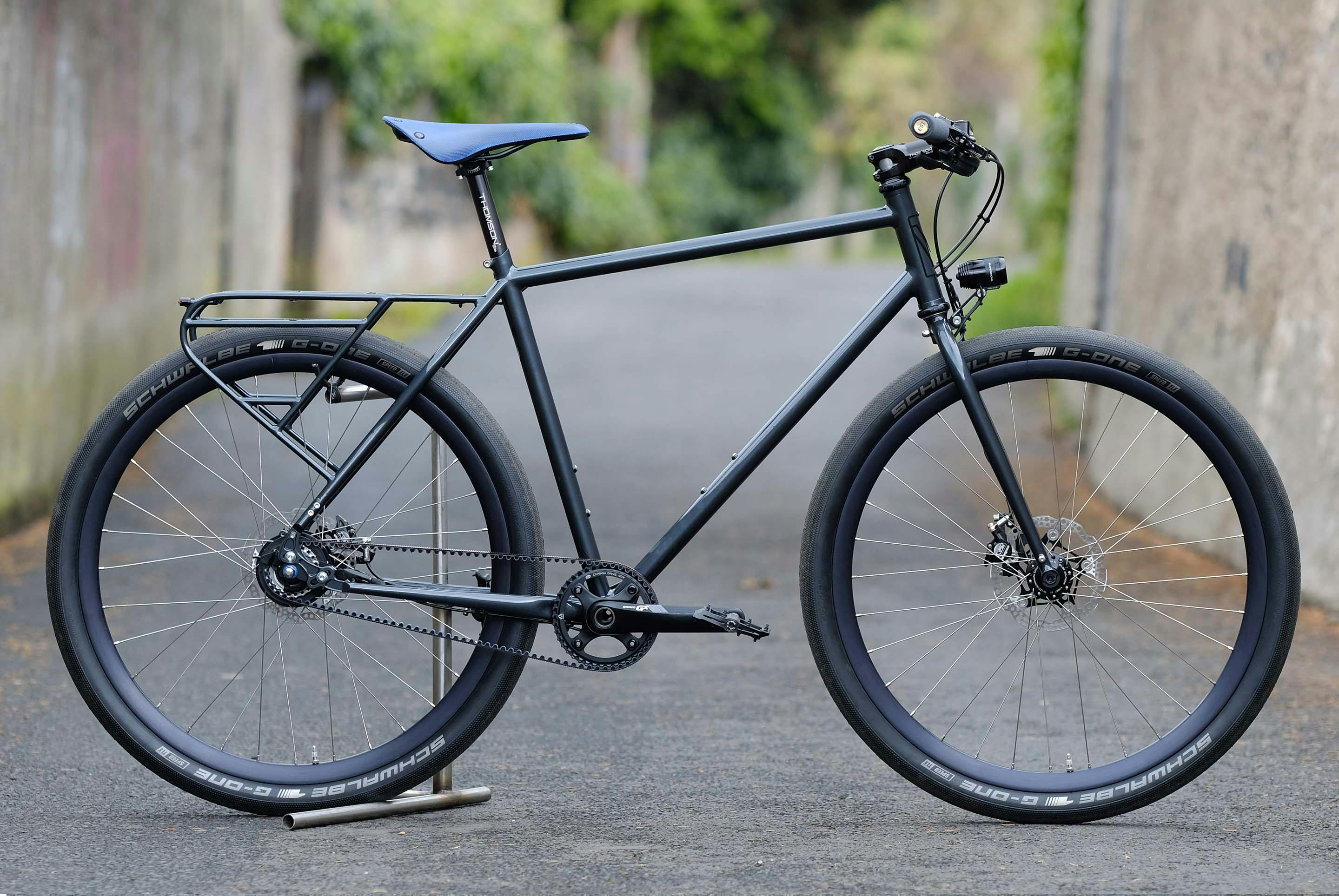 Le moyeu dynamo avant provient de chez SON. Il permet d'alimenter l'éclairage du vélo de manière autonome. Les roues de ce projet, rayonnées artisanalement chez nous, permettent cette configuration. Elles sont toutes deux en 700C, dimension choisie en fonction de la taille du client.