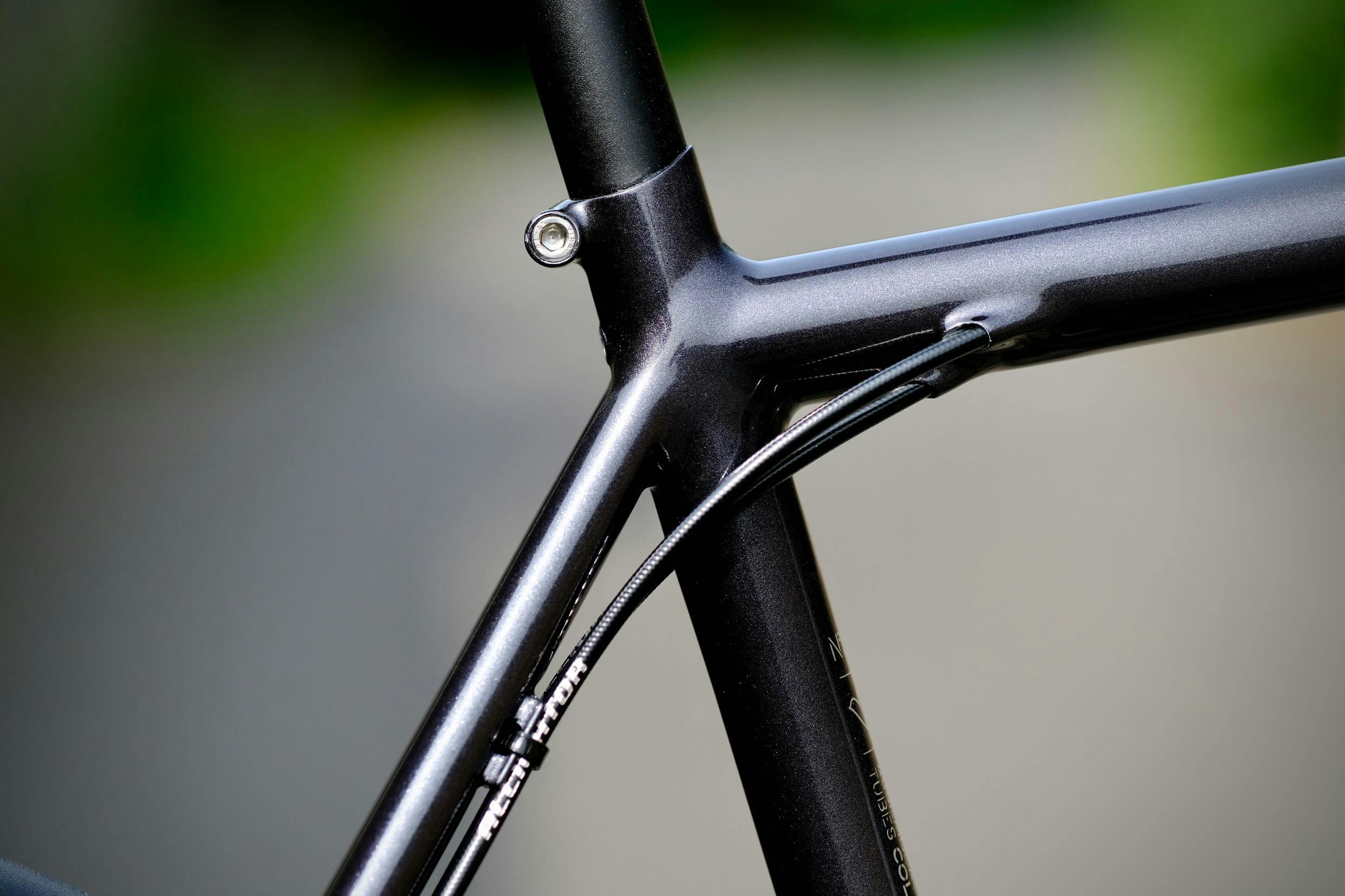 Pour protéger la peinture des frottements provoqués par les cables, nous soudons une barrette d'acier sur le tube de direction. Ce petit détail est devenu au fil des années une de nos marques de fabrique.