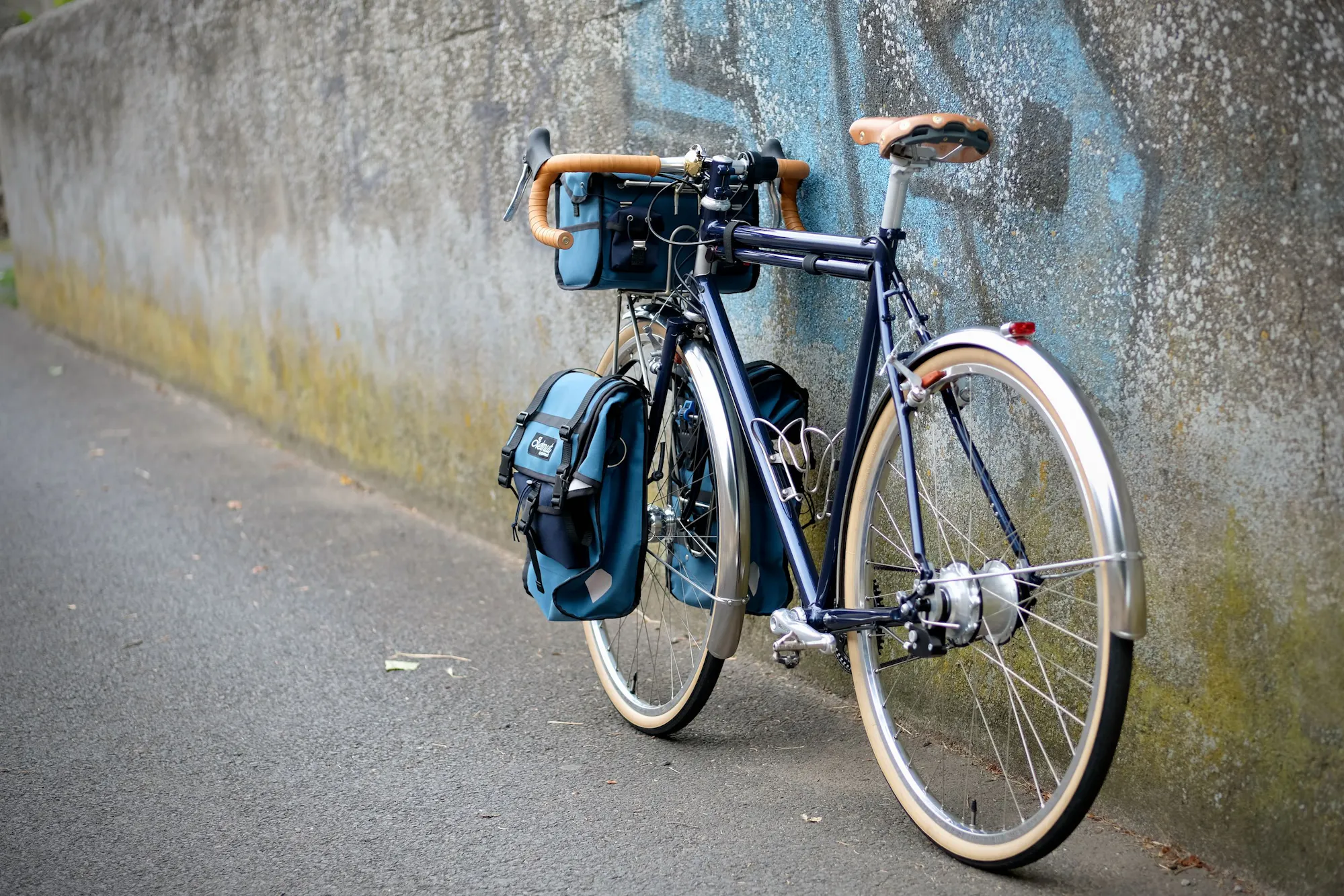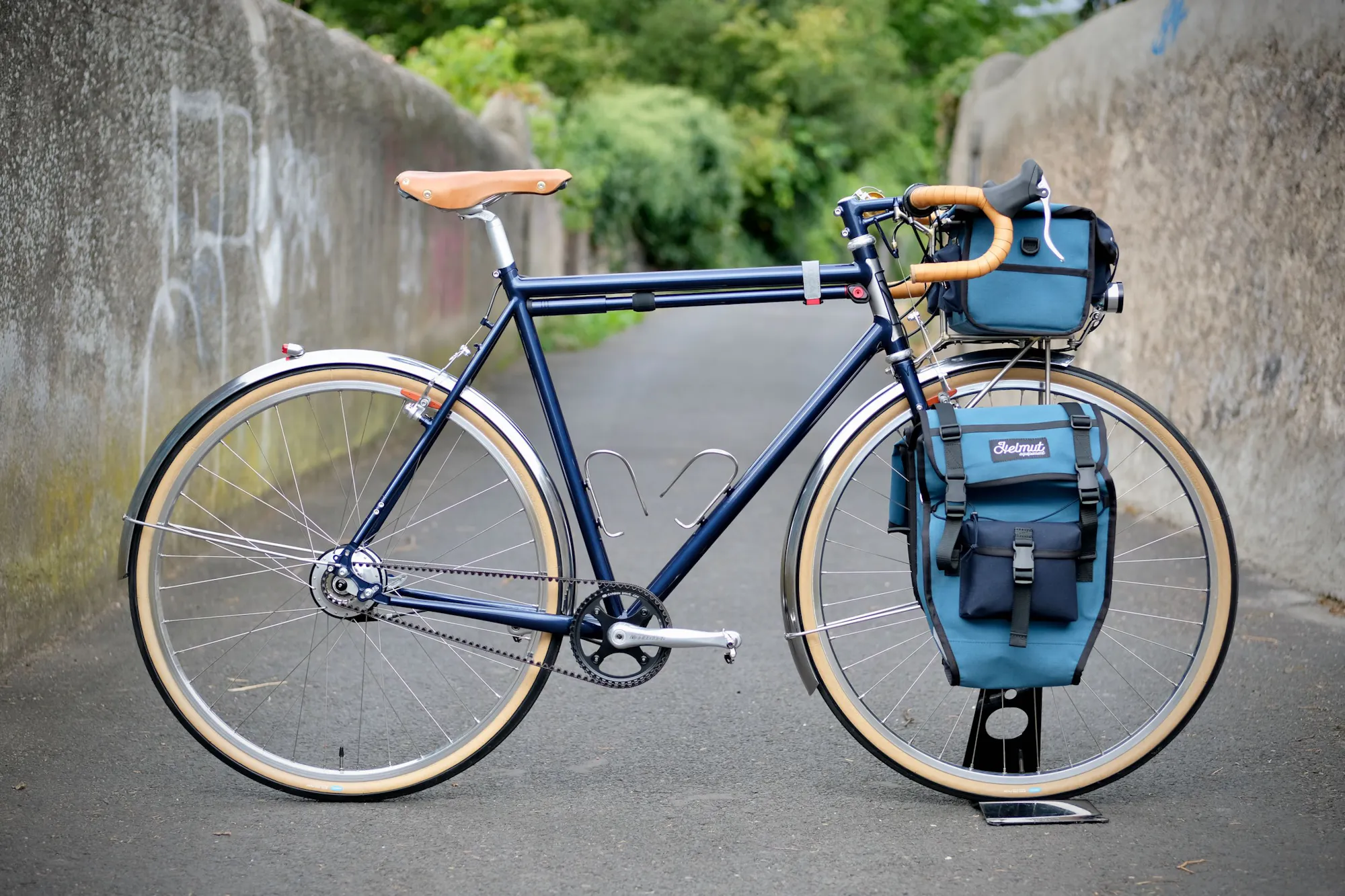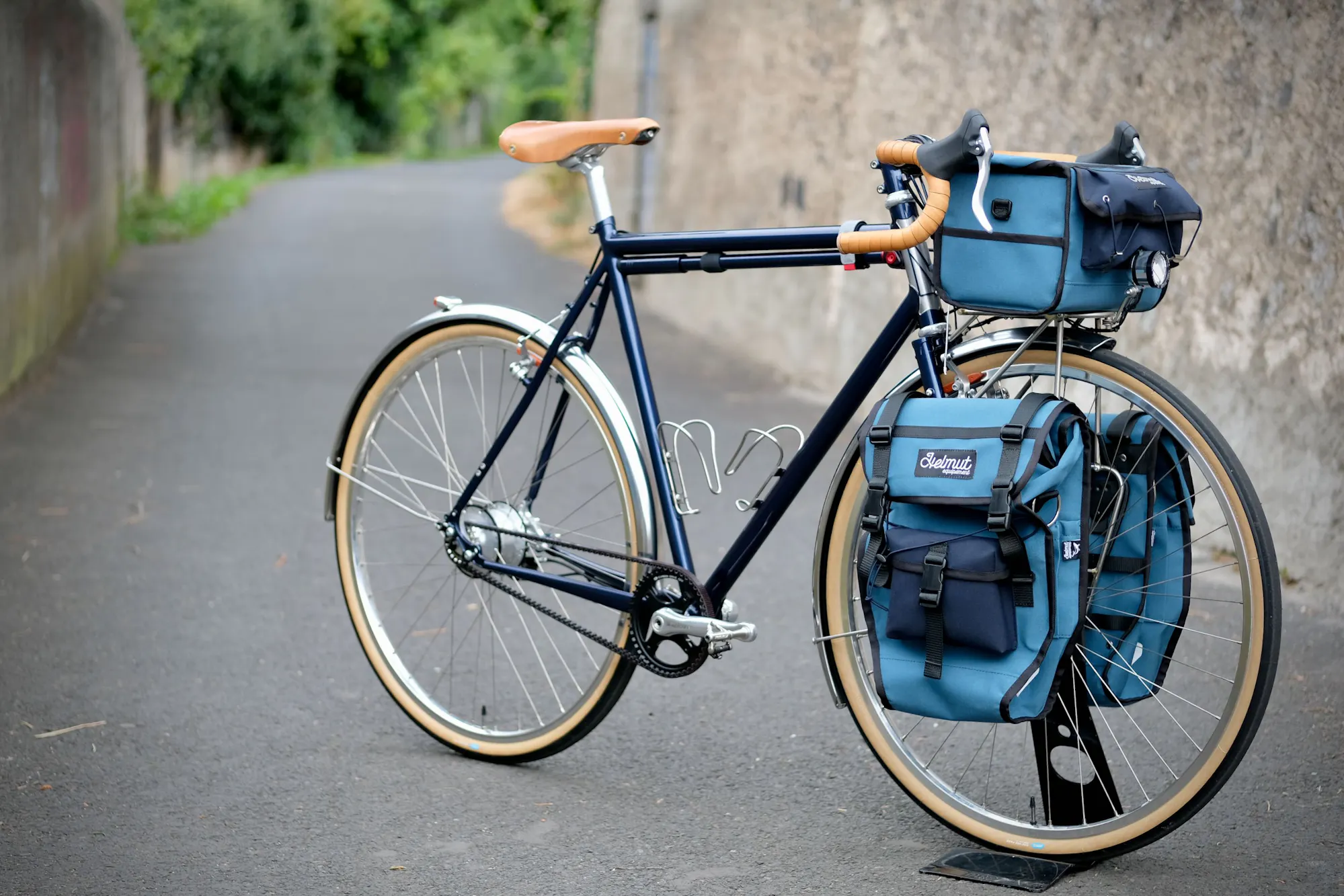 Les bagages sont fabriqués par notre partenaire Helmut équipement à Chambéry. La couleur a été choisie par Vincent pour être coordonnée à celle du cadre.