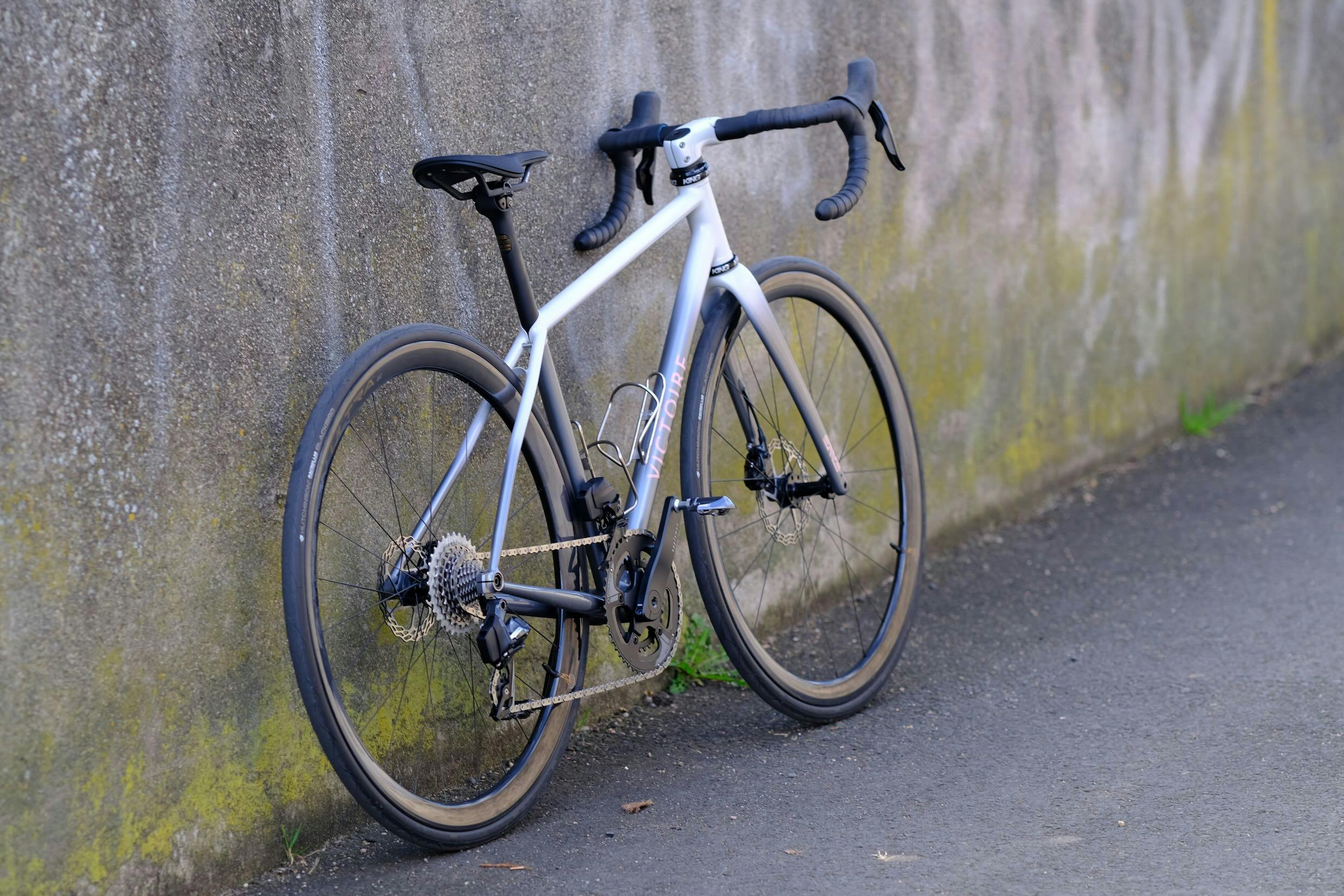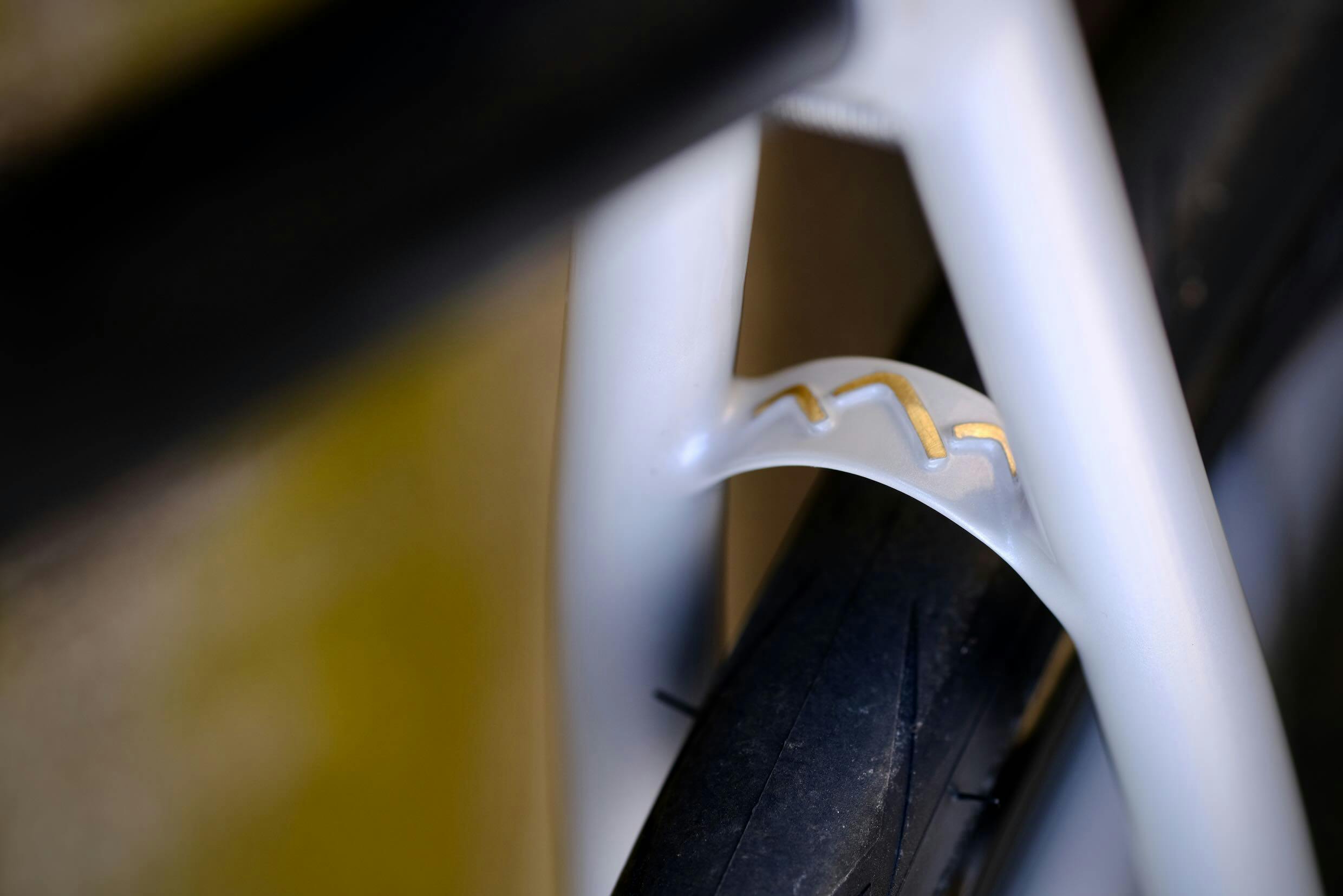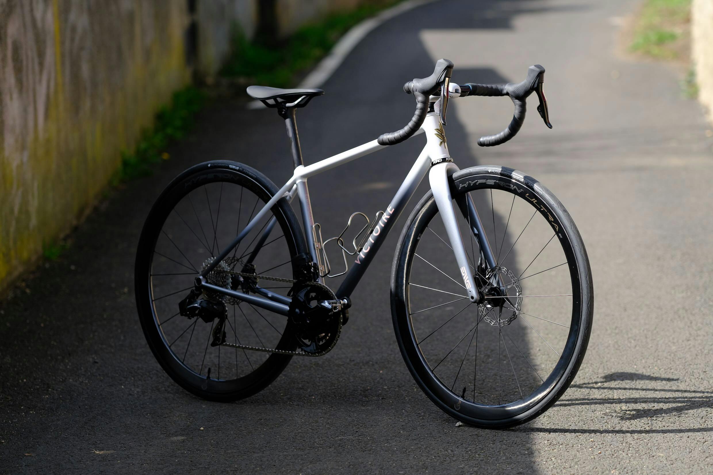Comme le vélo de son époux Patrice, la monture de Marie adopte une variation de teintes autour du gris et blanche, rehaussé de rose pour les logos Victoire et Enve. Et un peu de laiton apparent et simplement vernis pour le logo du pontet...