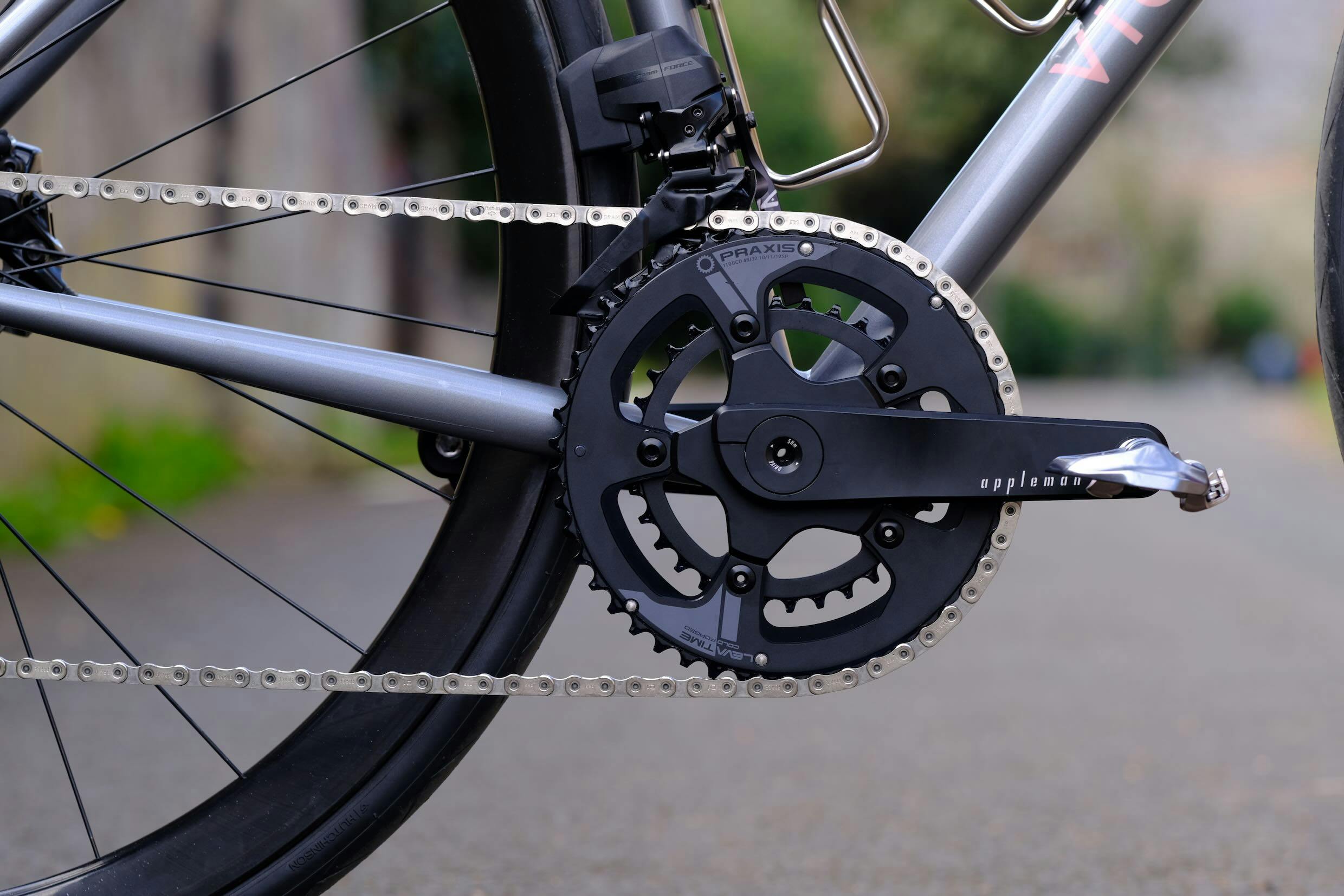 Nous avons toutefois remplacé quelques pièces de ce groupe par des choix personnalisés. Le plateau est fourni par Praxis Cycles, et les manivelles par Appleman.