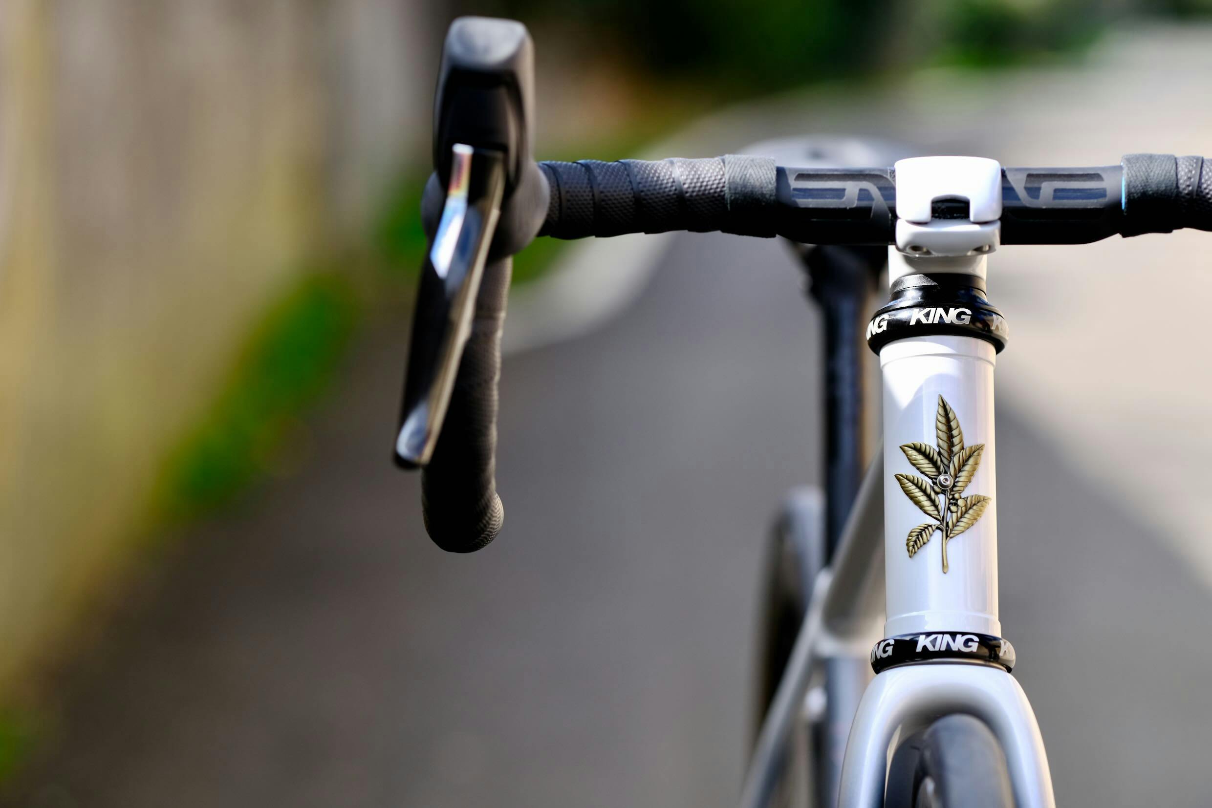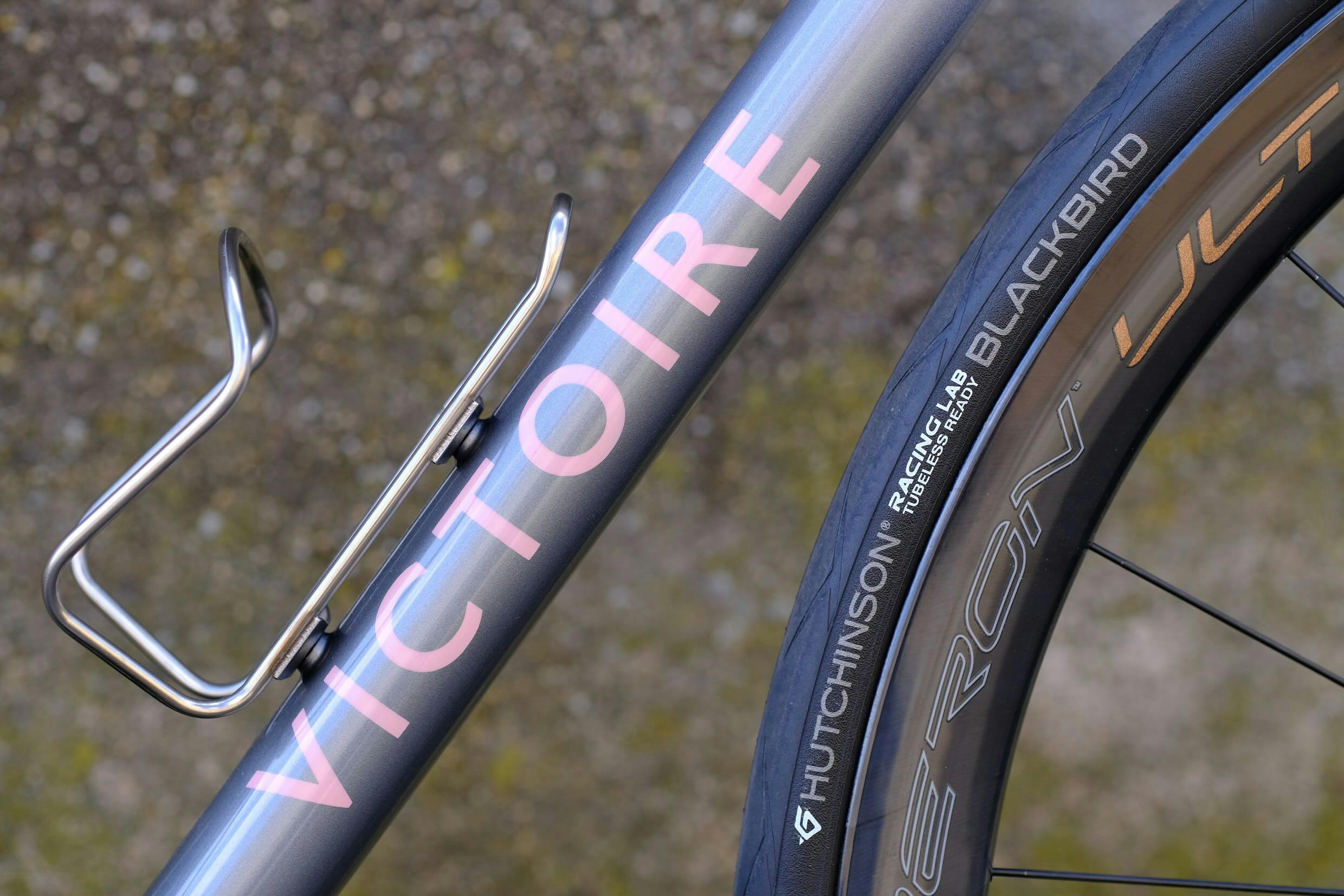 Comme le vélo de son époux Patrice, la monture de Marie adopte une variation de teintes autour du gris et blanche, rehaussé de rose pour les logos Victoire et Enve. Et un peu de laiton apparent et simplement vernis pour le logo du pontet...