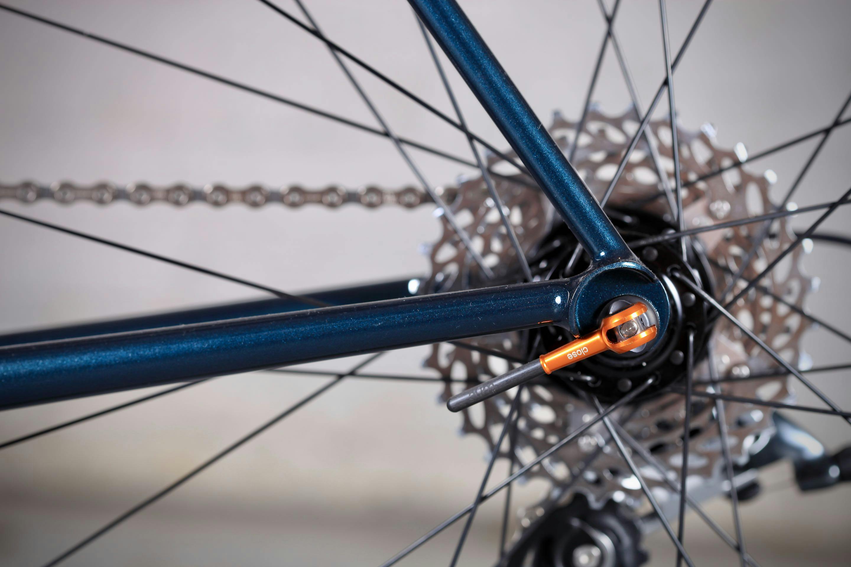 Les roues Tune, simples et légères, sont en harmonie avec le cadre et adaptées aux sorties alpines d’Agnès. Dans cette configuration, le vélo pèse huit kilos et l’emmènera en souplesse sur les pentes les plus raides.