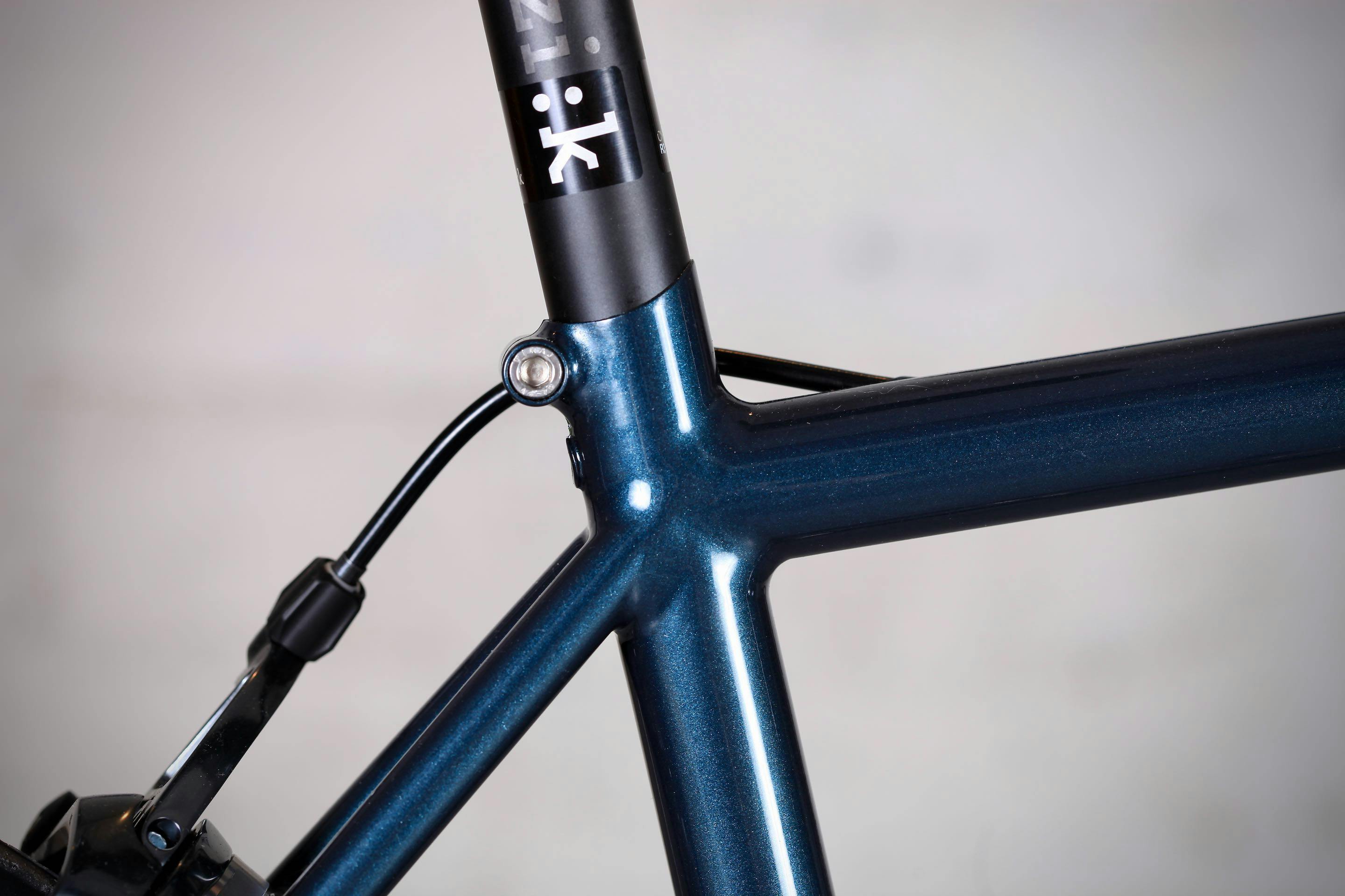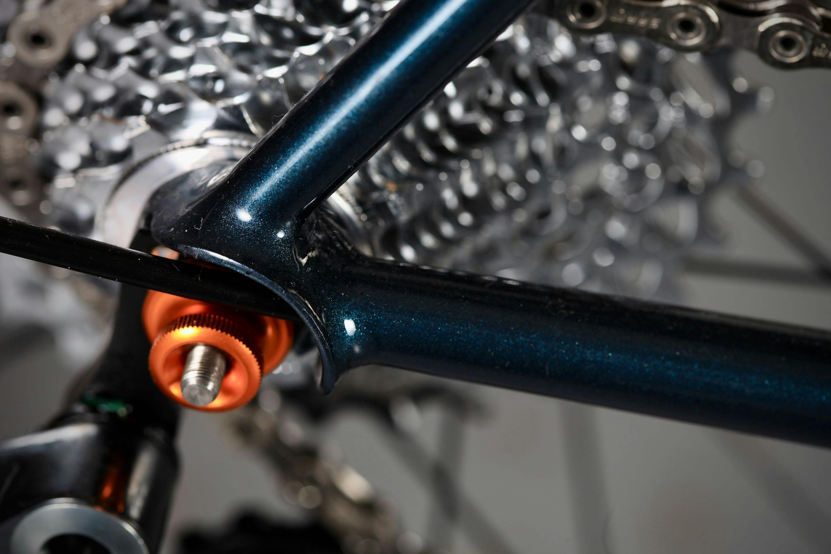 Agnès a un gabarit léger. Nous avons donc construit son cadre à partir de tubes très fins, les Tange Prestige Japan, pour un vélo facile à emmener sur les pente, mais aussi souple et doux, qui correspond à la pratique d'Agnès.