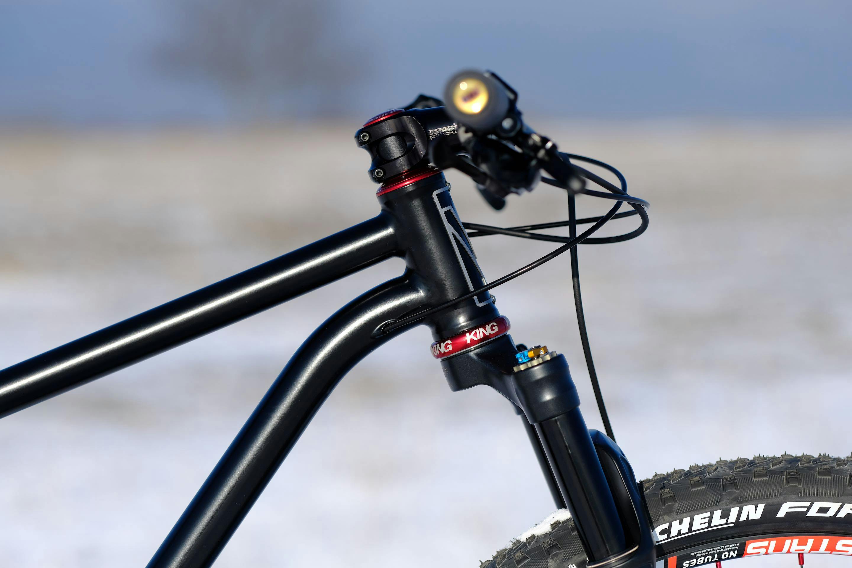 Guillaume a sélectionné le coloris noir pour la sobriété tout en y apportant un peu de lumière avec quelques éléments anodisés rouges (jeu de direction et boitier de pédalier Chris King, moyeux Tune, têtes de rayons, pédales Crankbrother).