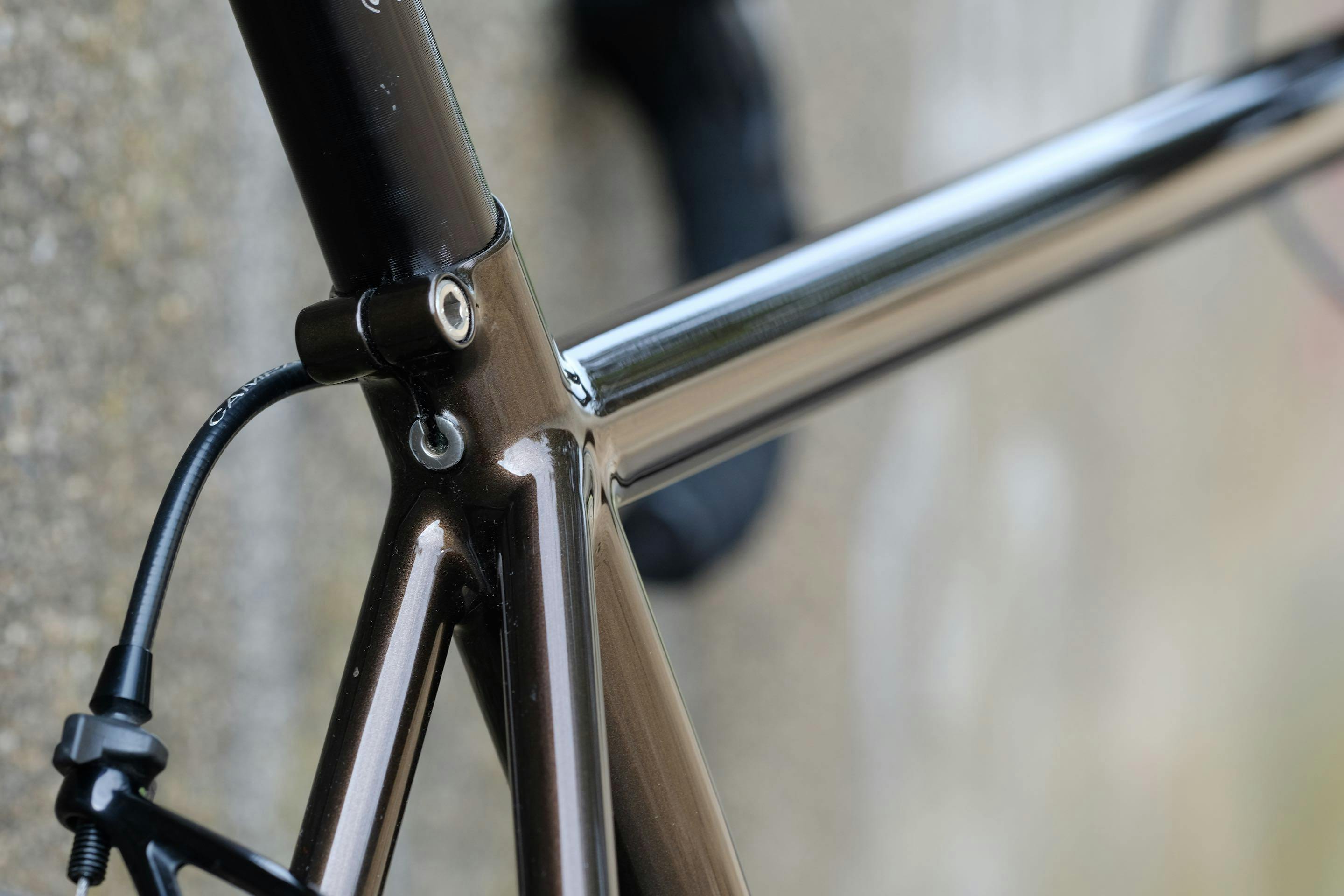 Si le cadre est en acier (Tange Prestige Japan), tous les points de contacts sont en inox, comme notamment les pattes de dérailleur. Cette caractéristique est commune à tous les cadres Victoire réalisés après le printemps 2020, sans exception. Ces zones sont laissées non peintes, ce qui empêche tout endommagement de la peinture tout au long de la vie du vélo.