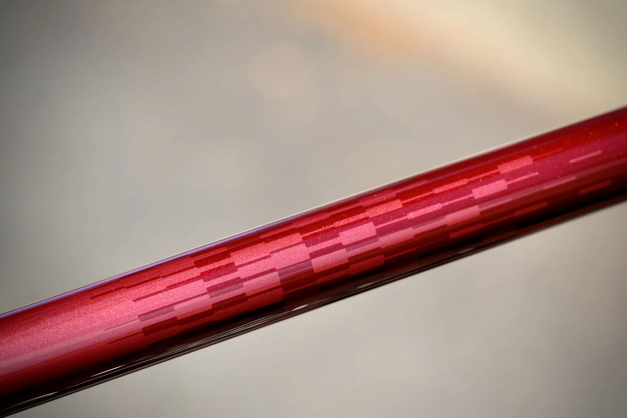 Le rouge du tube supérieur est décoré par l'ajout de motifs géométriques. Les paillettes souhaitées par Taryn ont été appliquées sur le bas de fourche et le capot de potence. Un dégradé permet de passer du rouge à la couleur naturelle de l'acier inox autour de la zone du pédalier et de la cassette.