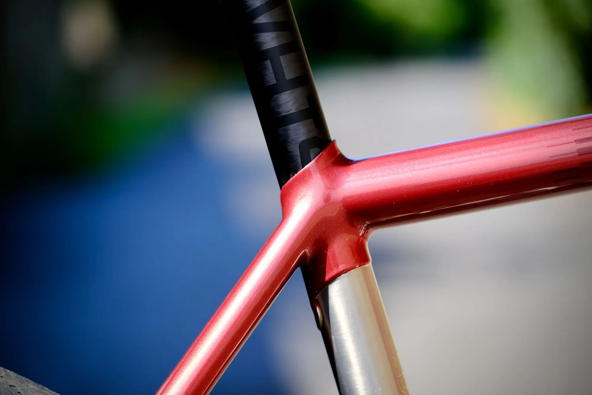 Le rouge du tube supérieur est décoré par l'ajout de motifs géométriques. Les paillettes souhaitées par Taryn ont été appliquées sur le bas de fourche et le capot de potence. Un dégradé permet de passer du rouge à la couleur naturelle de l'acier inox autour de la zone du pédalier et de la cassette.