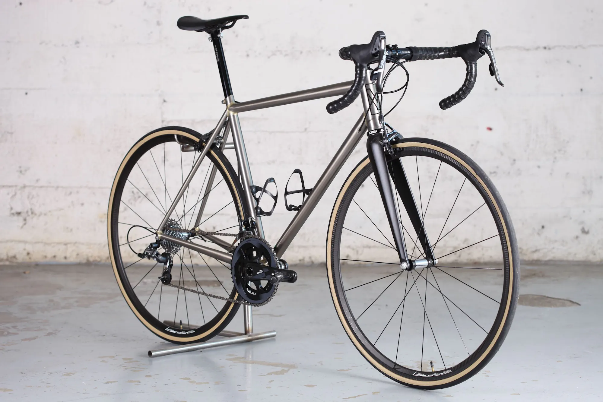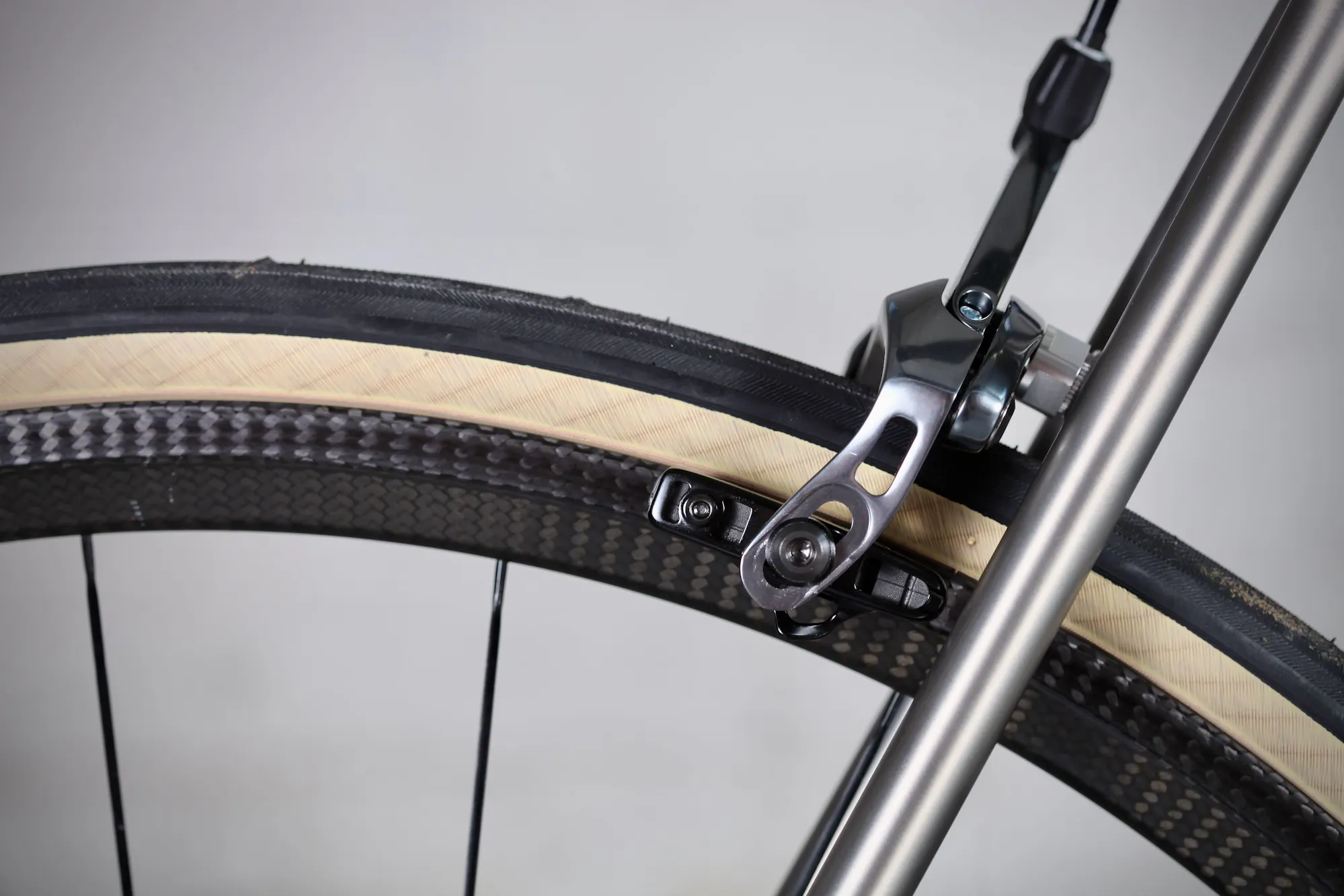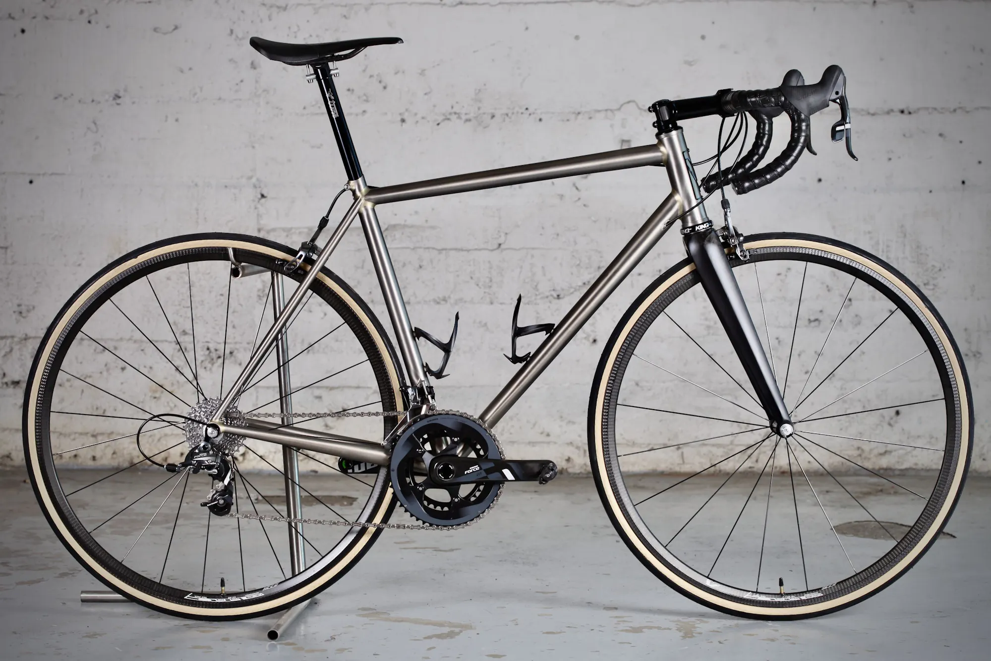 Daniel souhaitait un vélo intemporel, sobre et indémodable. Il a donc choisi la simplicité pour la finition du cadre, avec un aspect brossé protégé par un vernis mat réalisé en thermolaquage. Le cadre a été assemblé avec un groupe SRAM Force 22 et des composants Tune eux aussi sobres, efficaces et fiables.