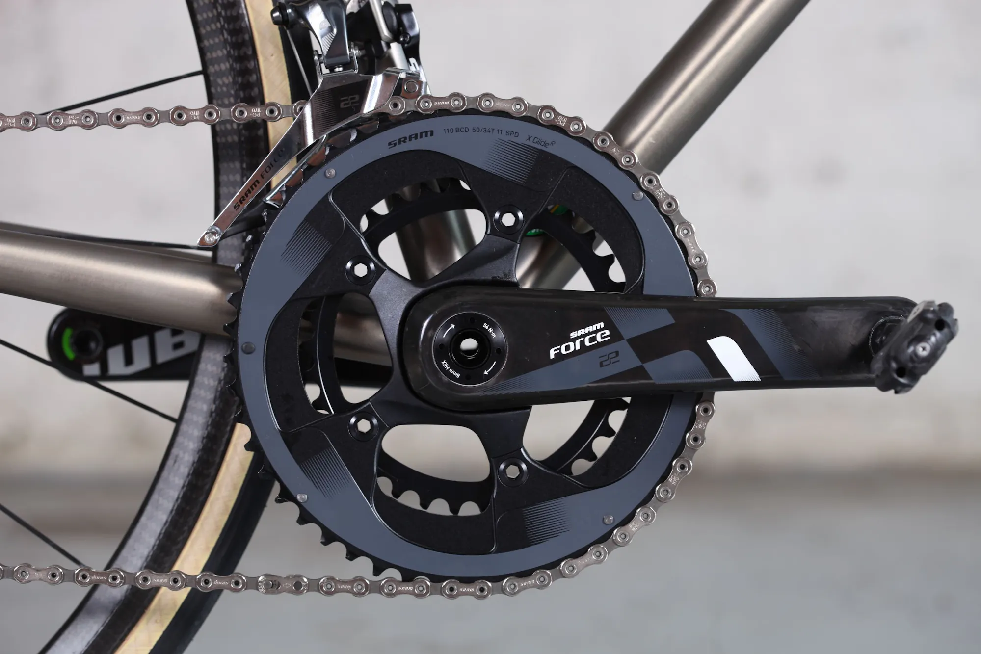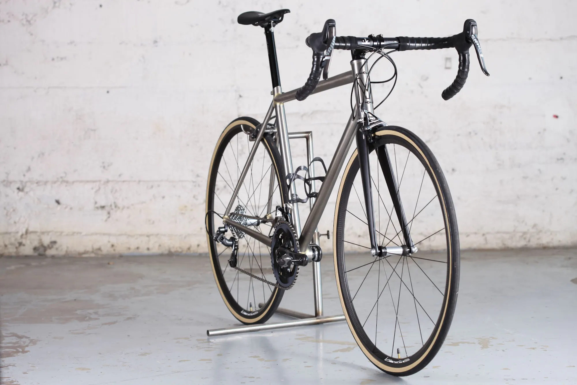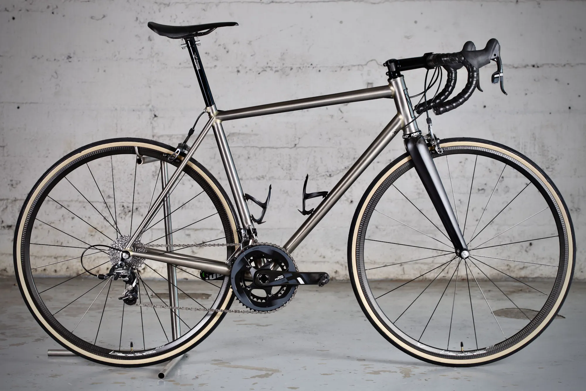 Daniel souhaitait un vélo intemporel, sobre et indémodable. Il a donc choisi la simplicité pour la finition du cadre, avec un aspect brossé protégé par un vernis mat réalisé en thermolaquage. Le cadre a été assemblé avec un groupe SRAM Force 22 et des composants Tune eux aussi sobres, efficaces et fiables.