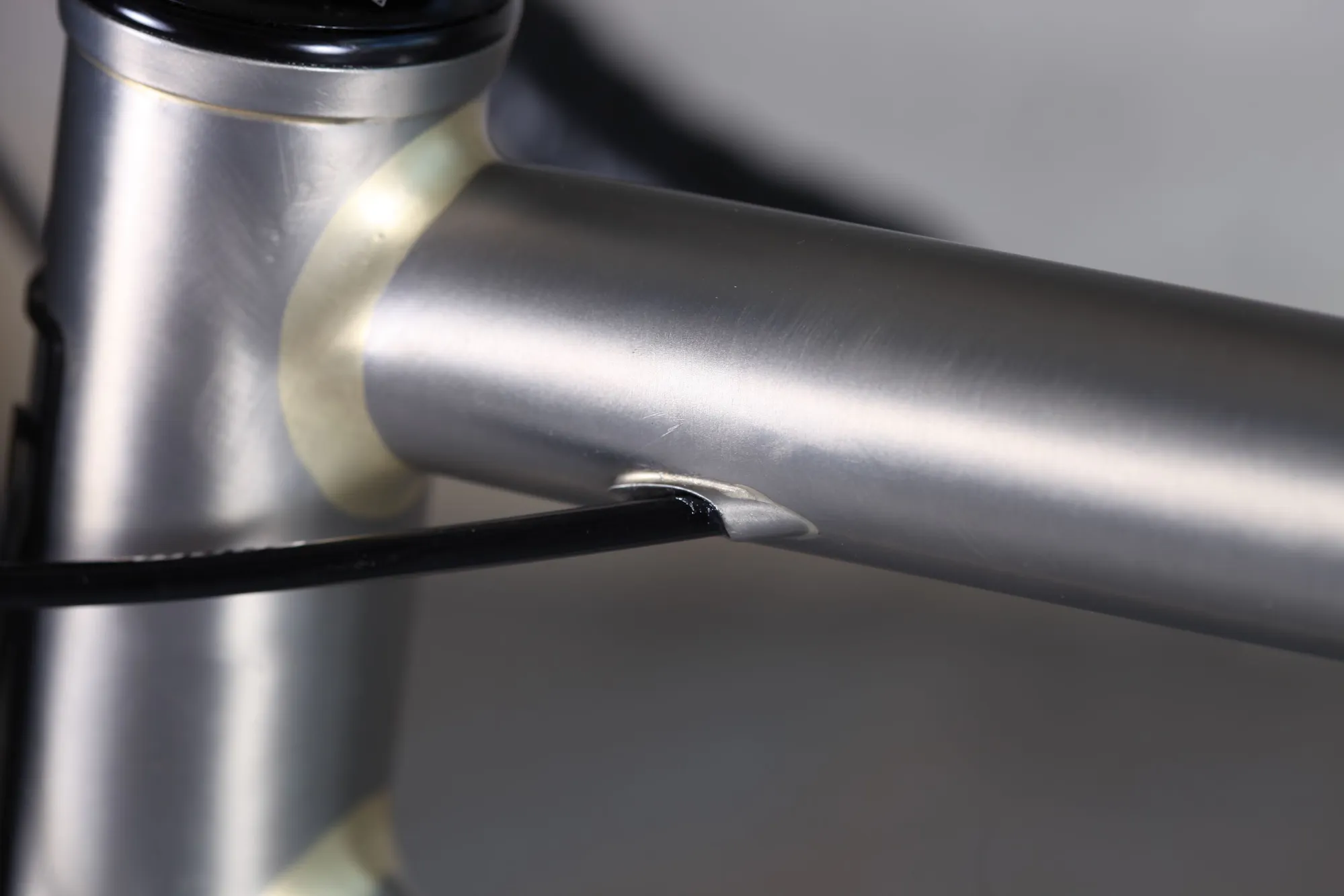 Afin d'accroître le confort sur les longues distance, les haubans choisis sont fins (16mm). Le vélo y gagne une ligne sobre, souhaitée par Daniel et renforcée par le passage interne avec guidage optimisé sous le boitier de pédalier. Comme sur tous les Victoire, la douille de direction est renforcée avec des bagues en inox brasées aux extrémités. Le collier de selle voit sa fente renforcée par une rondelle en inox et les inserts de porte-bidon sont usinés maison et étanches.